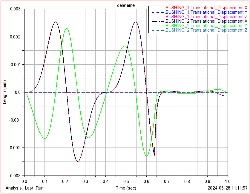 After running a simulation, we can plot the displacement of the bushes against time, showing values below 0.003 mm of displacement.