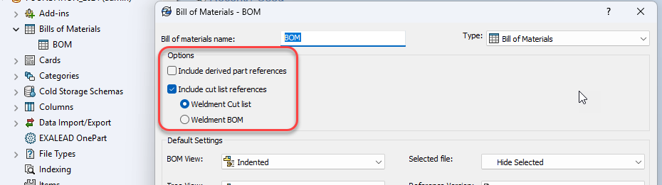 Also within the BOM configuration interface is the option to ‘Include Derived Part References’ within BOM structures.