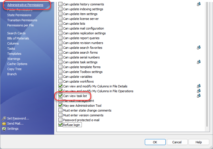 A new administrative permission ‘Can view task list’ was added into SOLIDWORKS PDM 2023, allowing users to view the task list and perform all actions available within the Task List Dialog (e.g. Cancel) without requiring the ability to create or modify tasks as per previous releases.