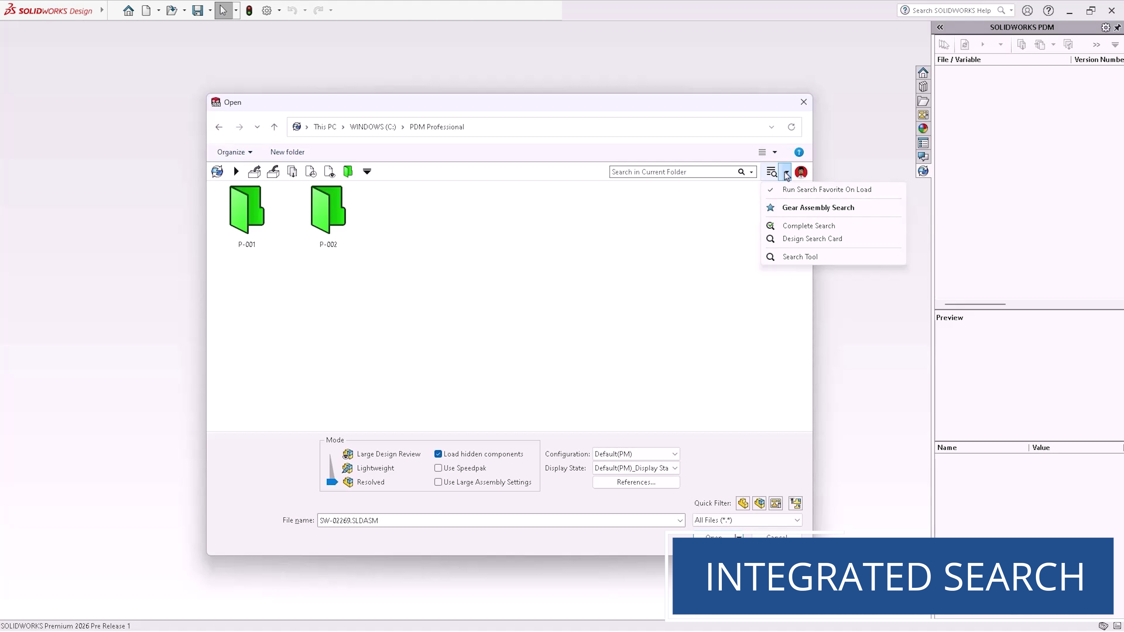 SOLIDWORKS PDM 2026 introduces a redesigned search interface featuring a split-button layout.