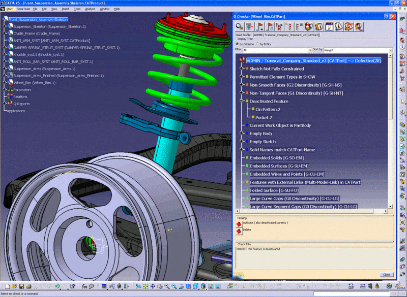 • Checking files transferred from other CAD software: CATIA users frequently need to use multiple CAD systems and data, a practice that frequently leads to problems with data translation. This usually calls for significant reworking and redesigning. Q-Checker helps to catch errors and adjust standards quickly and effectively, allowing for speedy recovery.