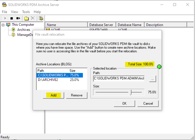 Note: Due to the way PDM identifies and structures the data within the archive, it is split into 16 folders. When relocating, a whole folder will be moved (it cannot exist in two places) so by moving 25% of the archive to the D: Drive I am actually moving four archive folders. The size of those folders is not inspected, so 25% of the archive may not actually be 25% of the archive size.